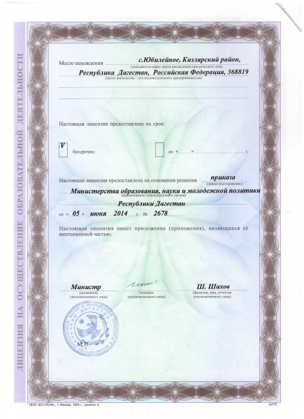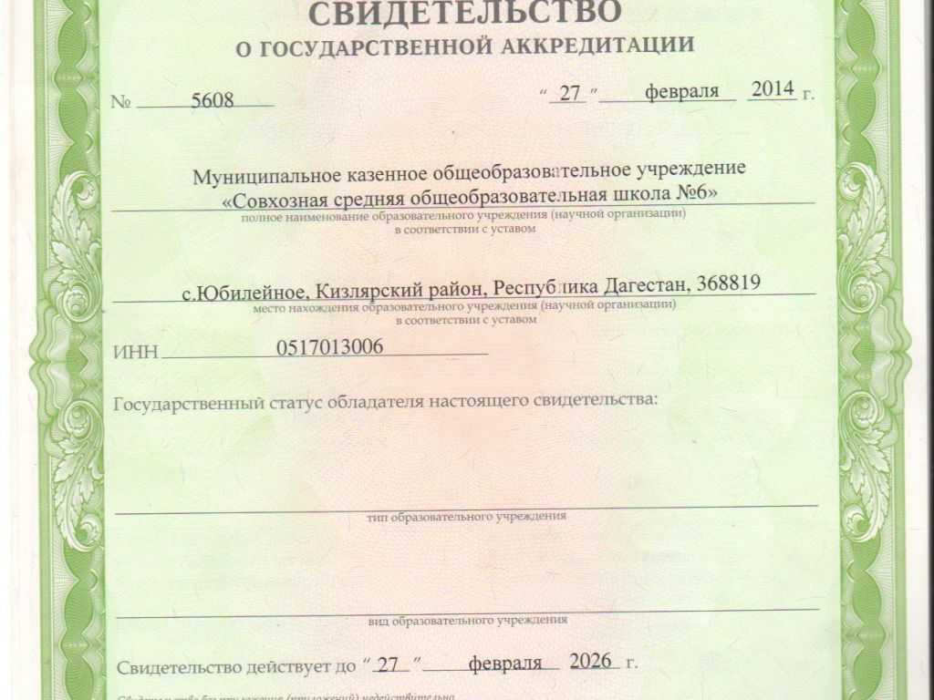 | Адрес местонахождения образовательной организации* | 368819, Кизлярский район сел. Юбилейное ул. Досова 23 |